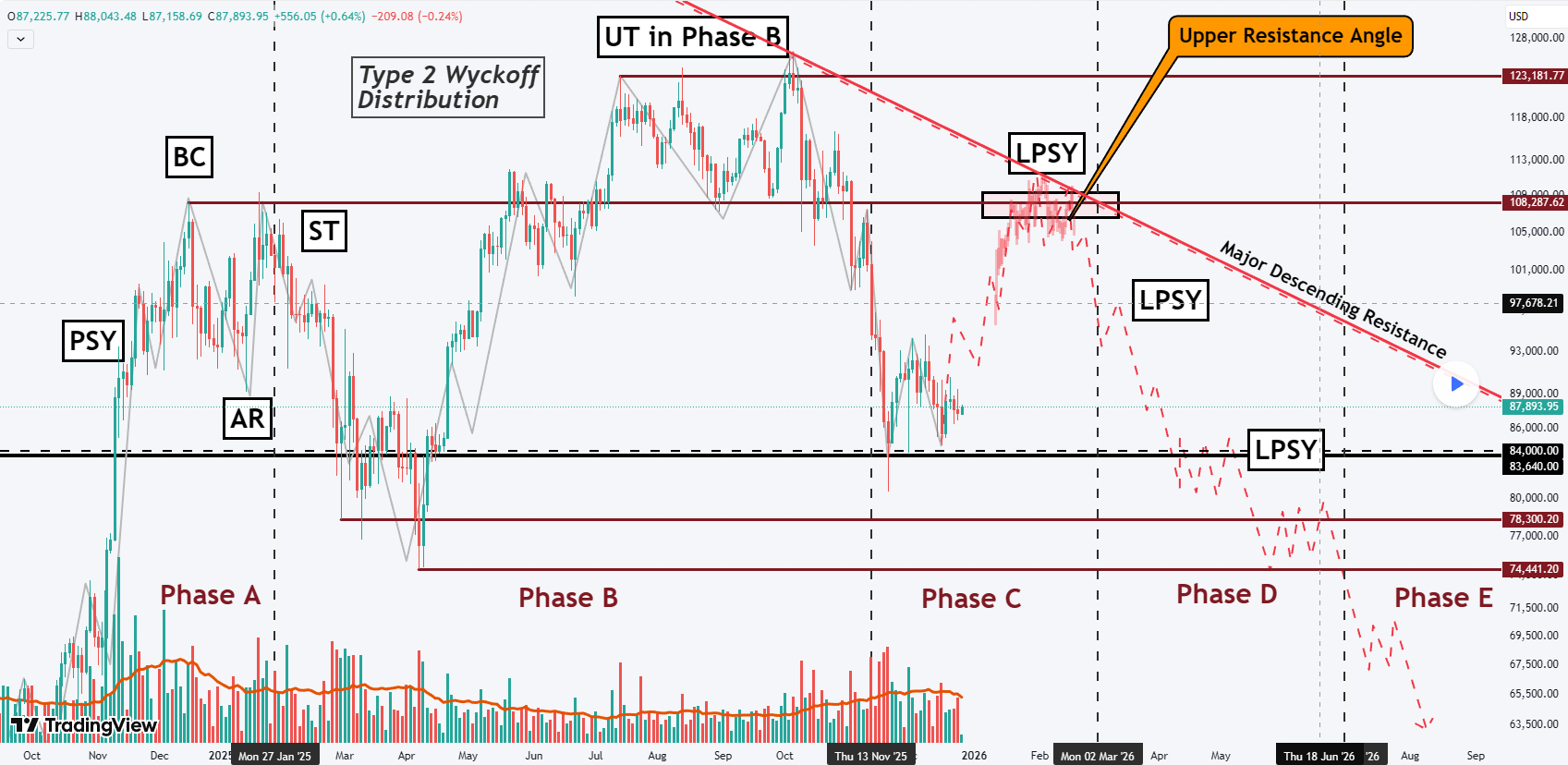 Riziko pro rok 2026: Pokud se tento model potvrdí, rok 2026 bude odpovídat Fázím D a E Wyckoffova schématu. To znamená prolomení klíčových podpěr (supportů) a vstup do dlouhodobého sestupného trendu (Markdown phase).