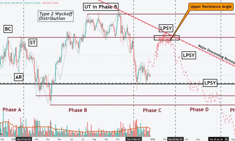 Riziko pro rok 2026: Pokud se tento model potvrdí, rok 2026 bude odpovídat Fázím D a E Wyckoffova schématu. To znamená prolomení klíčových podpěr (supportů) a vstup do dlouhodobého sestupného trendu (Markdown phase).